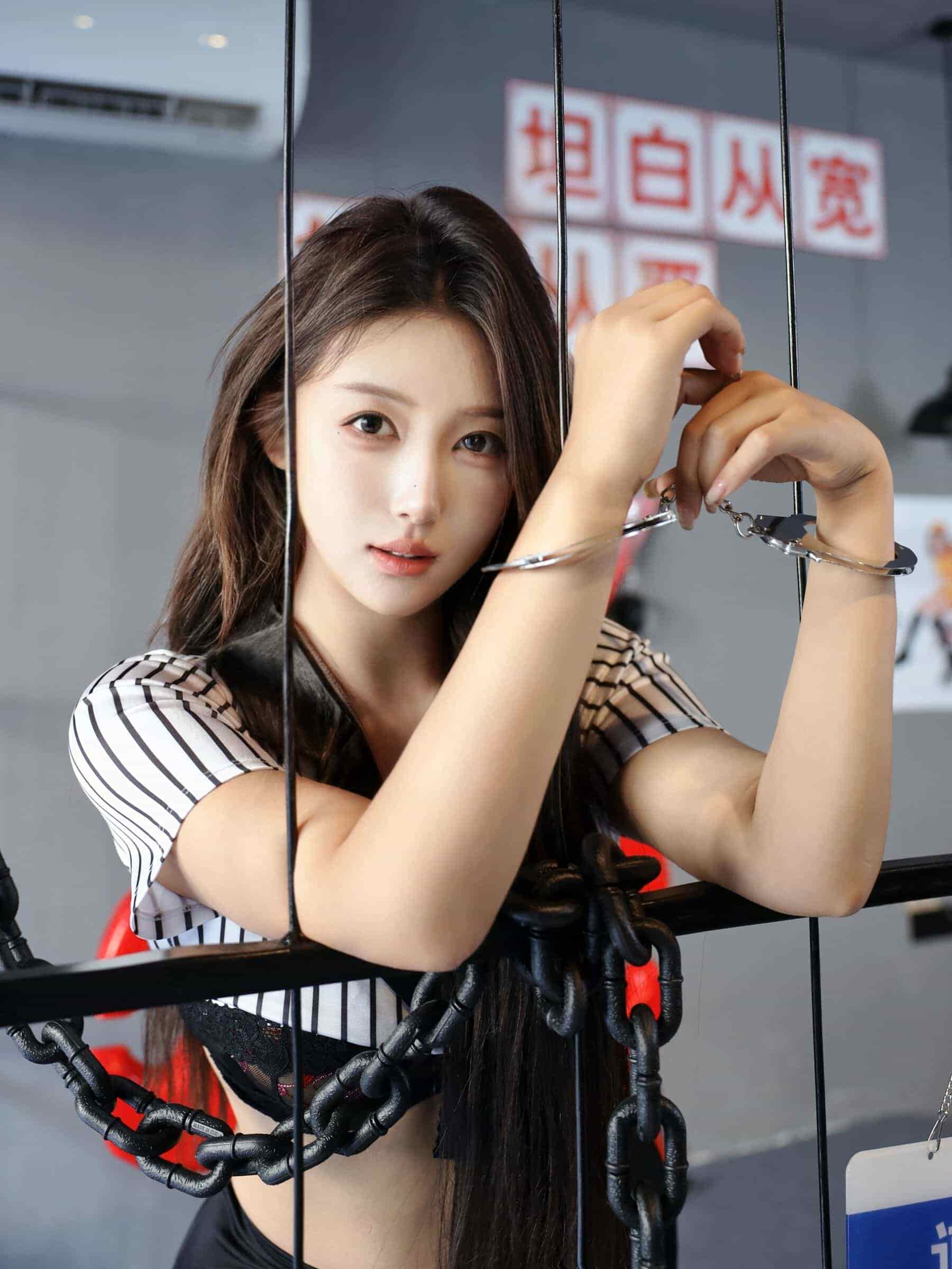 - 动作表现:模特采用了极具张力的姿势,修长的双腿高高抬起,不仅展示了惊人的柔韧性,更将腿部的线条美发挥到了极致。颈部的黑色项圈(Choker)更是点睛之笔,增添了一份神秘而叛逆的束缚感。